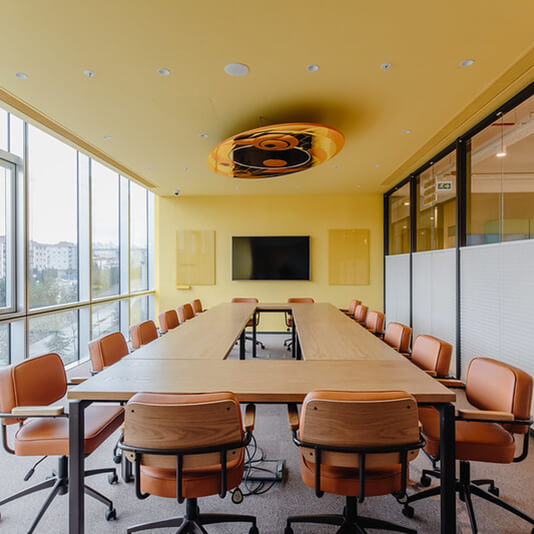 Güneş ışığının duvarlarda ve zeminde dans ettiği aydınlık bir odada toplantını yapmak ister misin? Hadi o zaman parlak fikirlerin çarpıştığı efektif ekip toplantılarının göz bebeği toplantı odamıza!
